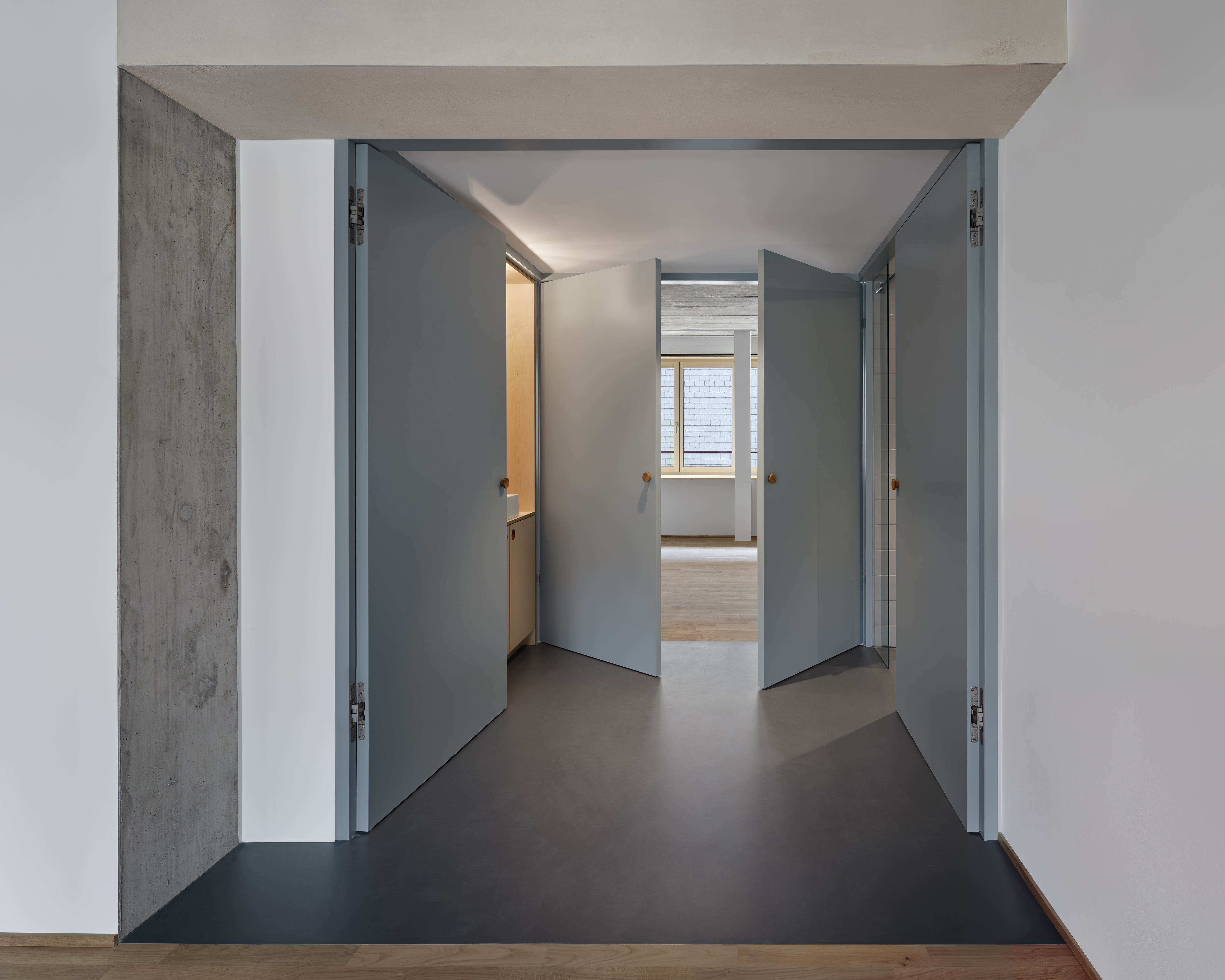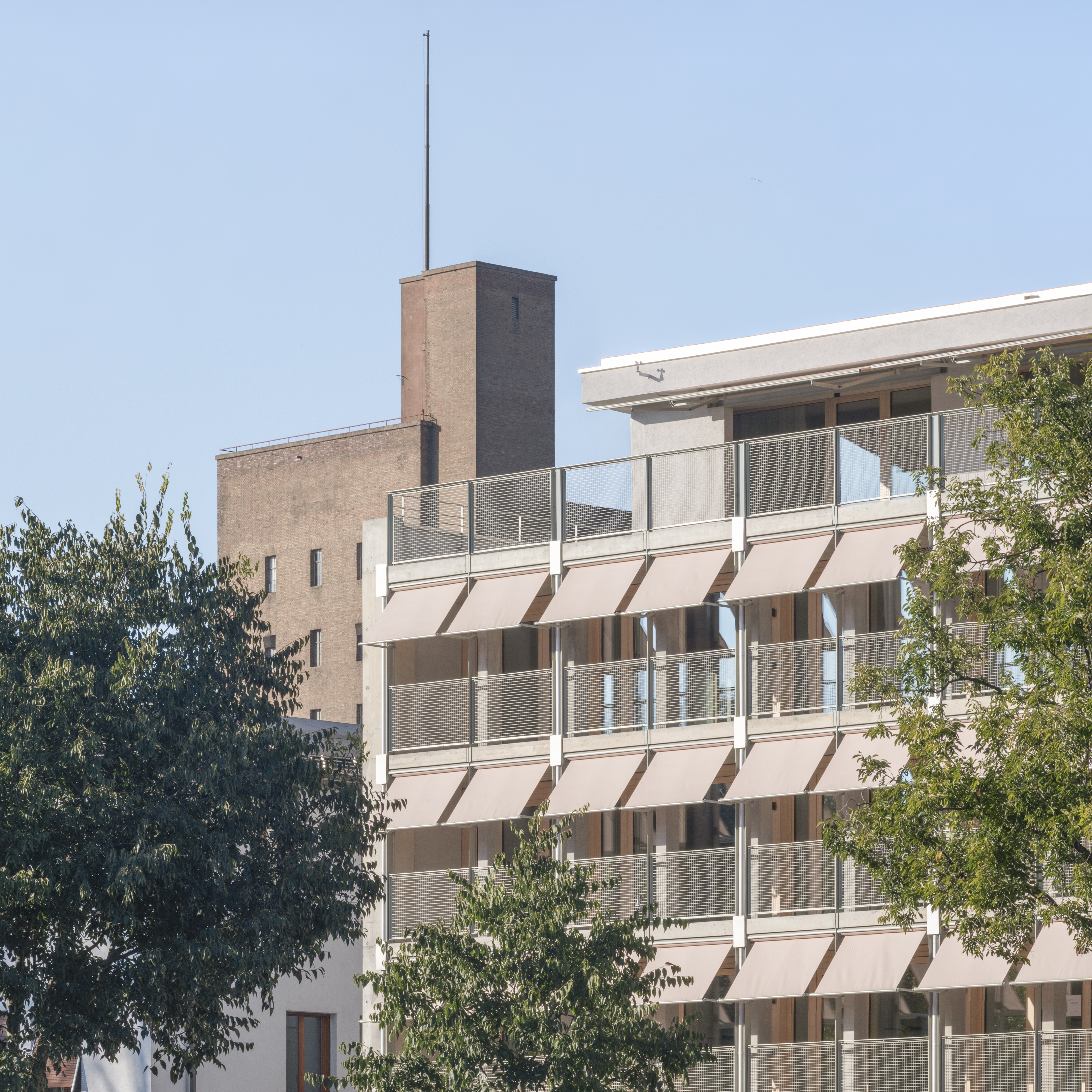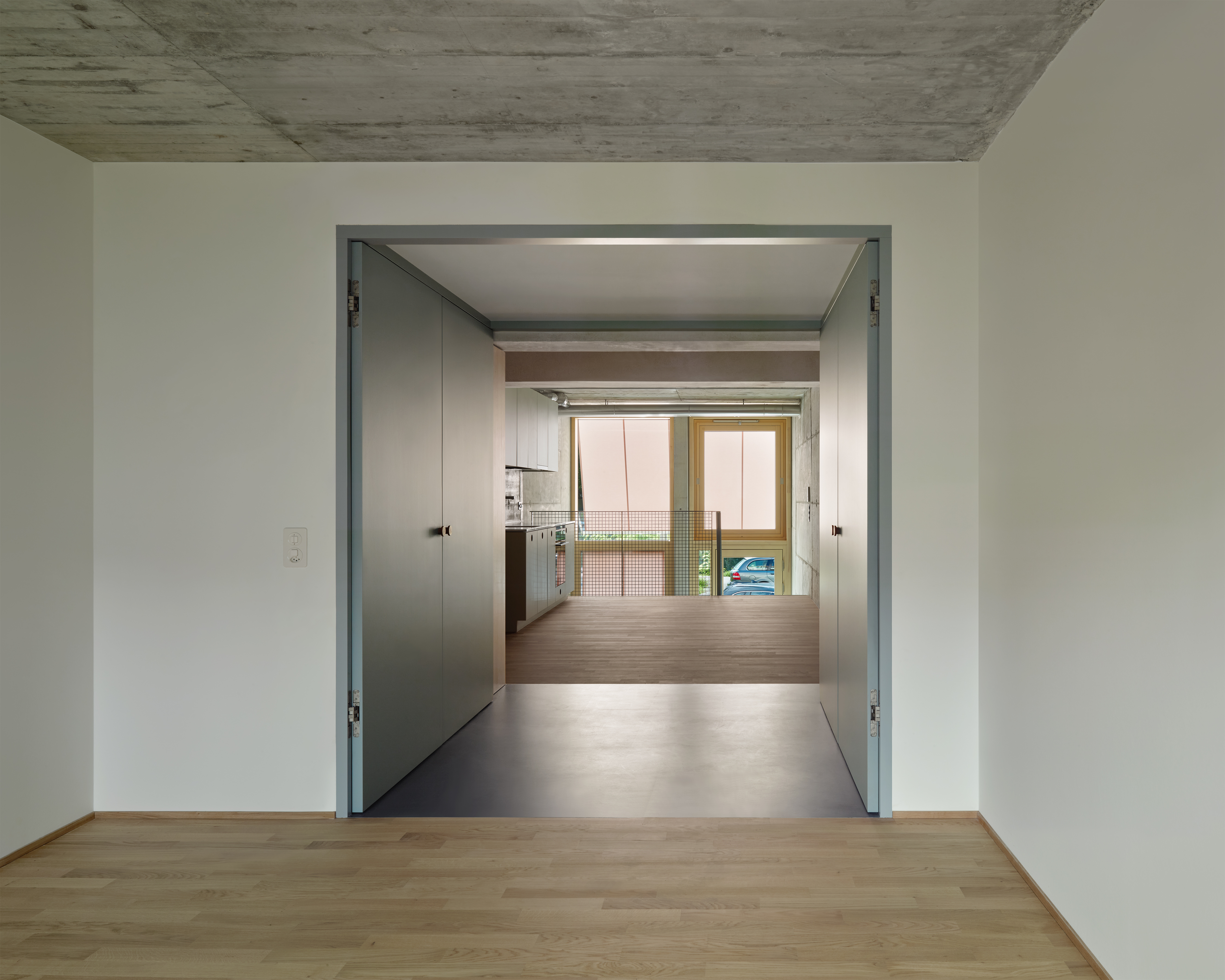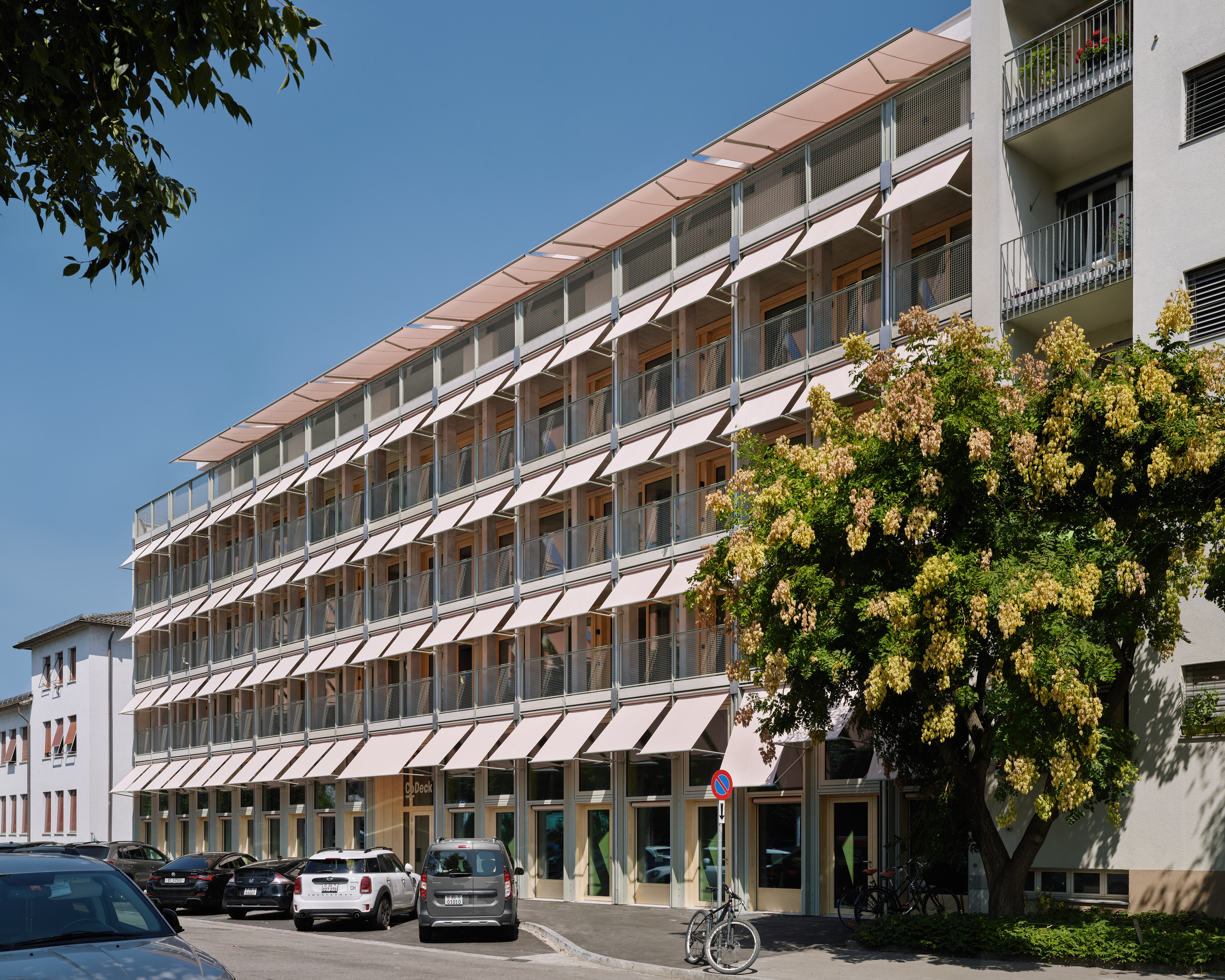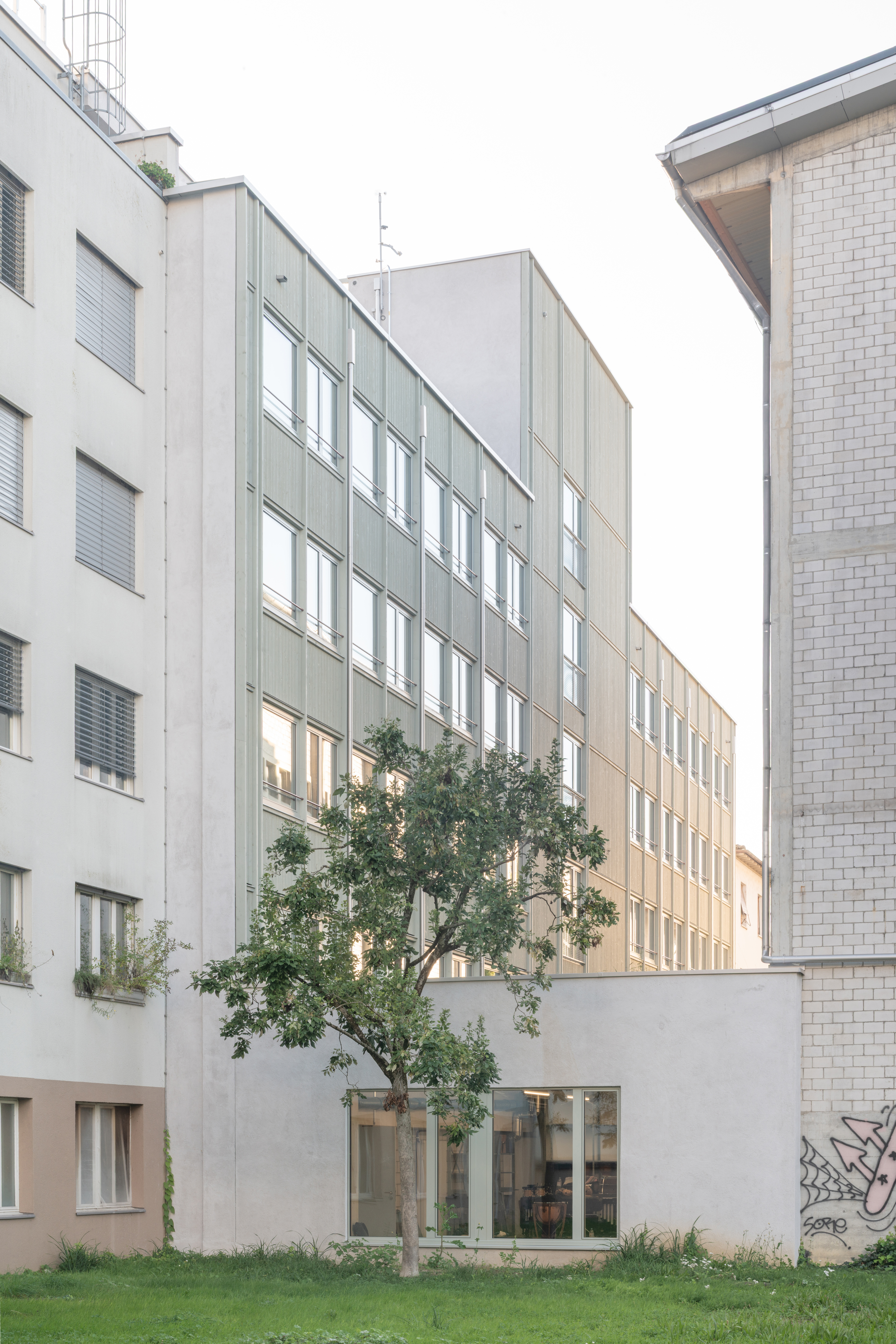 The building will be converted into dwellings for smaller households, communal spaces for residents and neighbours, as well as ateliers and coworking spaces. Its design is based on the idea of an arcade facing the street façade that connects all flats and creates a common space for interaction and spontaneous encounters. The layering of different boundaries creates a gradient of privacy, from the street and the arcade through the living rooms and kitchens to the bedrooms in the north, overlooking a quiet courtyard.